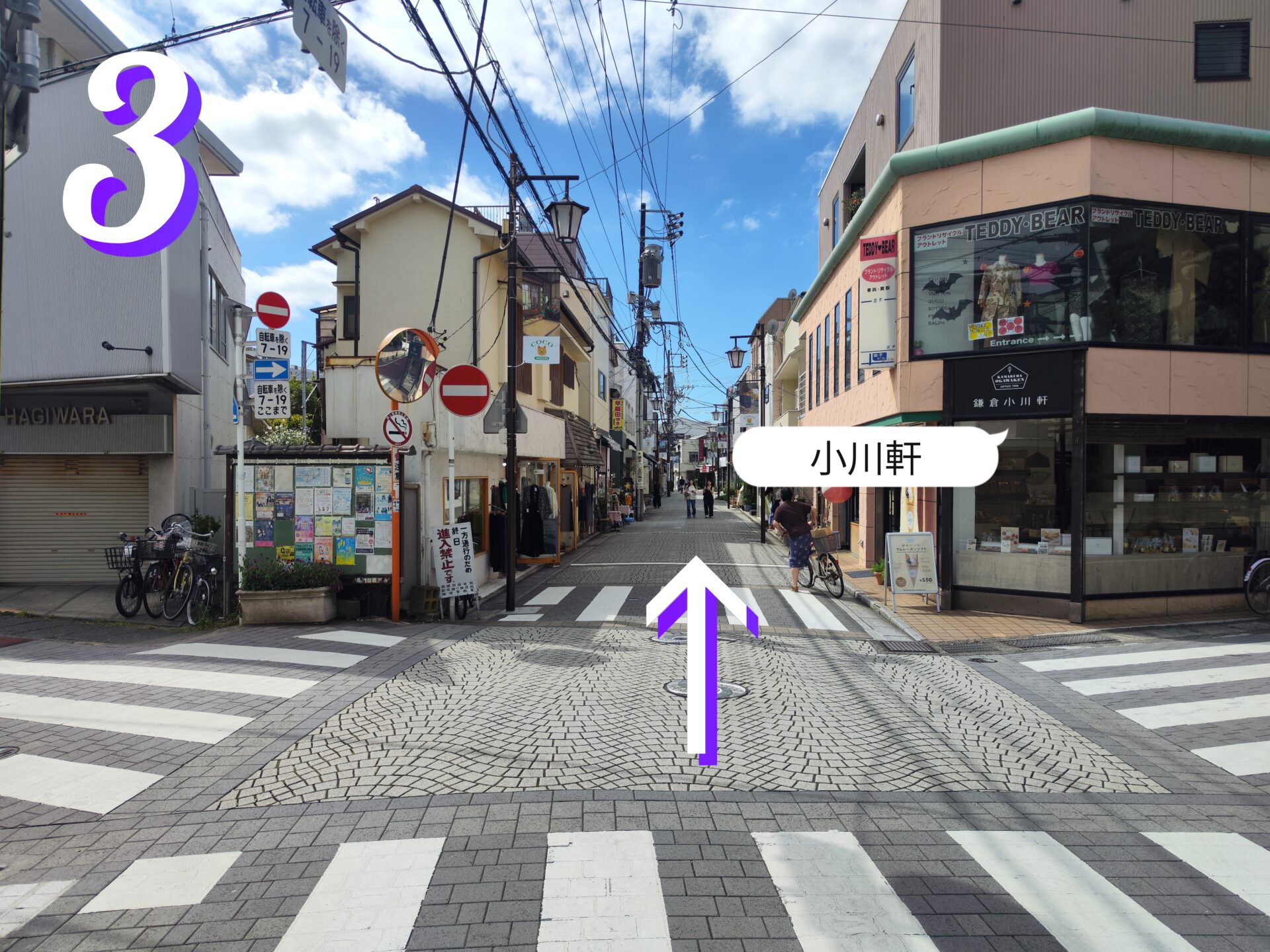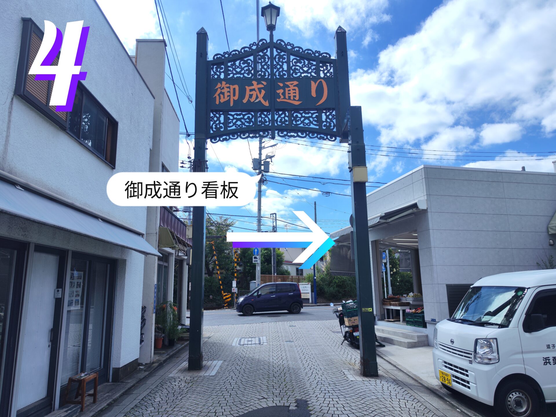 4.御成通りの看板が見えたら右に曲がります。
